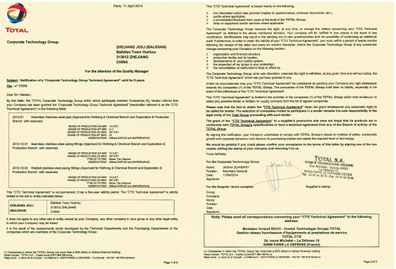 道達爾公司是公認的世界上對供應商資格要求最嚴格的石油公司之一。獲得道達爾公司的供應商資質(zhì)批準,對久立特材具有積極的意義,為久立跟道爾達公司進一步進行合作奠定了堅實基礎。這次獲得批準是繼久立被英荷殼牌、?松梨诘扰鷾屎,又一次被國際大型石油公司批準。這些批準不僅是對久立的肯定,更是對久立的激勵,激勵久立繼續(xù)努力,以成熟可靠的技術和可靠的產(chǎn)品質(zhì)量去服務更多用戶,為全球工業(yè)裝備提供安全可靠的久立產(chǎn)品。